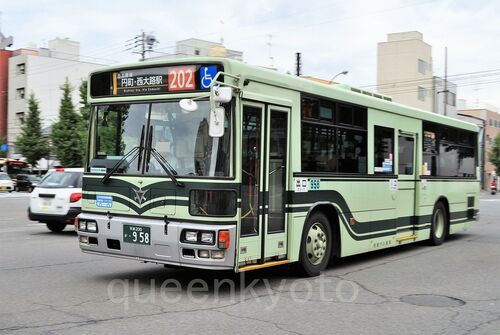 202号系統。担当は九条営業所(直営)。循環路線で旧市電の代替え路線の為、早朝から深夜まで走っています。 東山通では観光路線として、西大路通では通勤通学等、地元の足として活躍している路線です。 九条営業所を出発した202号系統(甲)(反時計回り)…